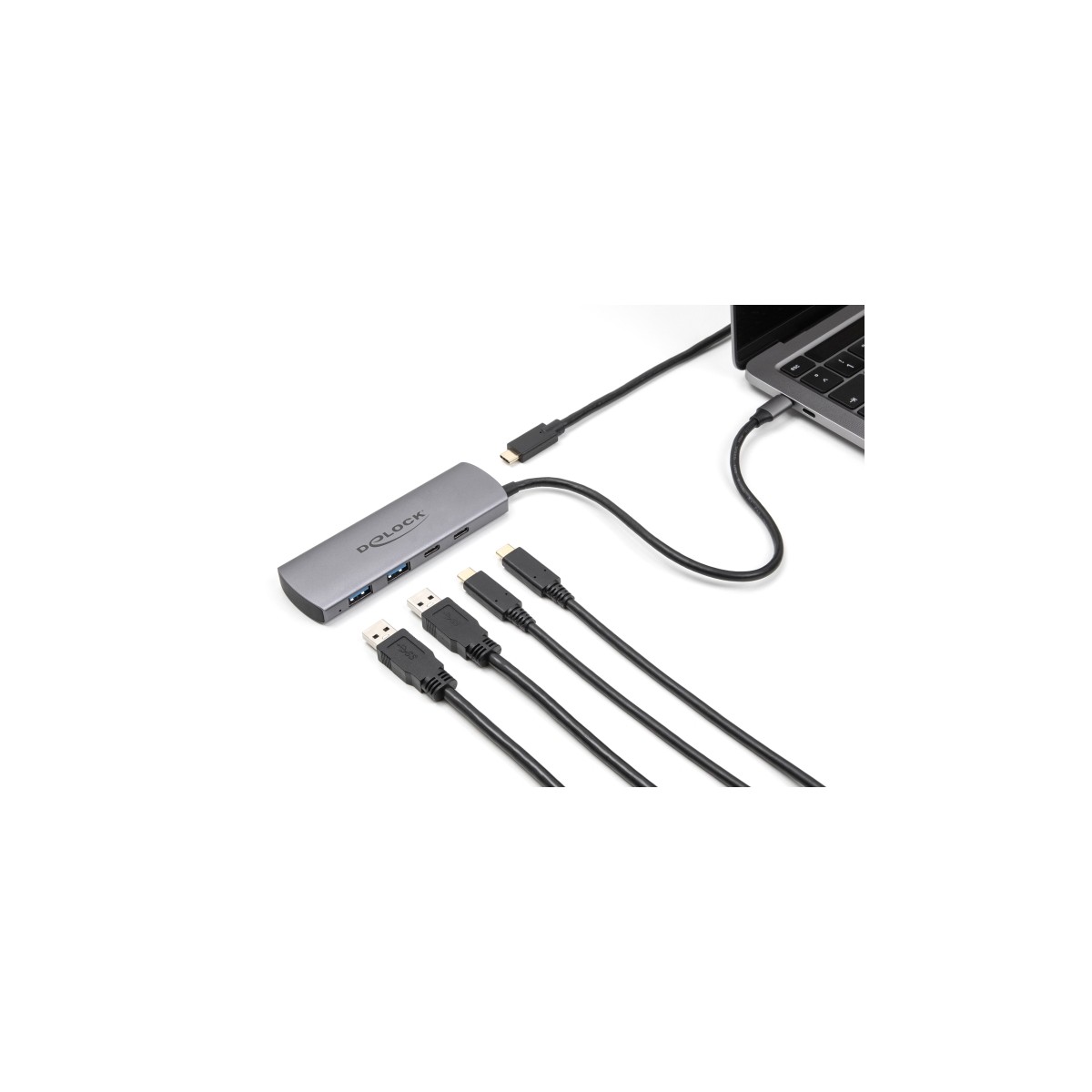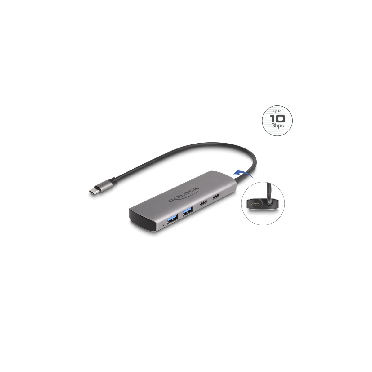 This solid USB hub by Delock with metal housing can be connected to a computer, laptop or mobile device via the USB Type-C™ interface. It has two USB Type-A connectors as well as two USB Type-C™ connectors. Different USB devices such as USB flash memory, card reader, external enclosure etc. can be connected.