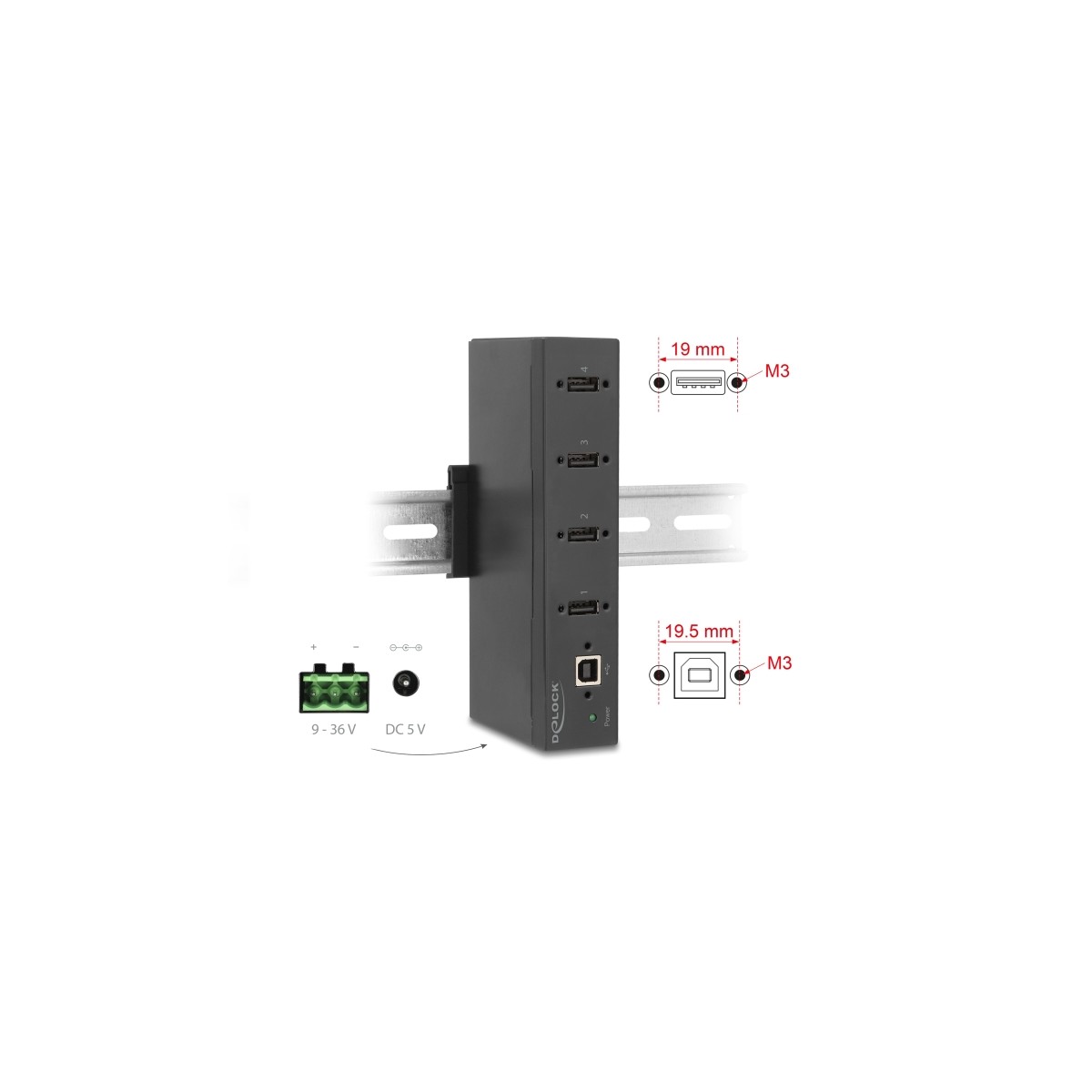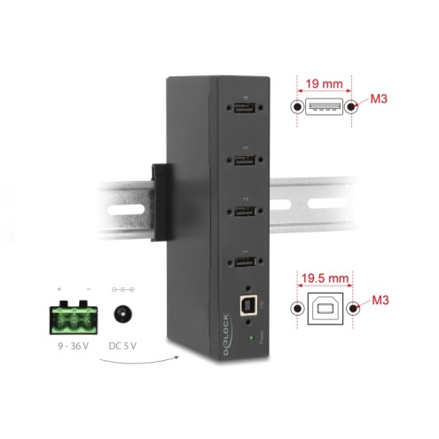 Delock Industry Hub 4 x USB 2.0 Type-A with 15 kV ESD protection and DIN rail mounting