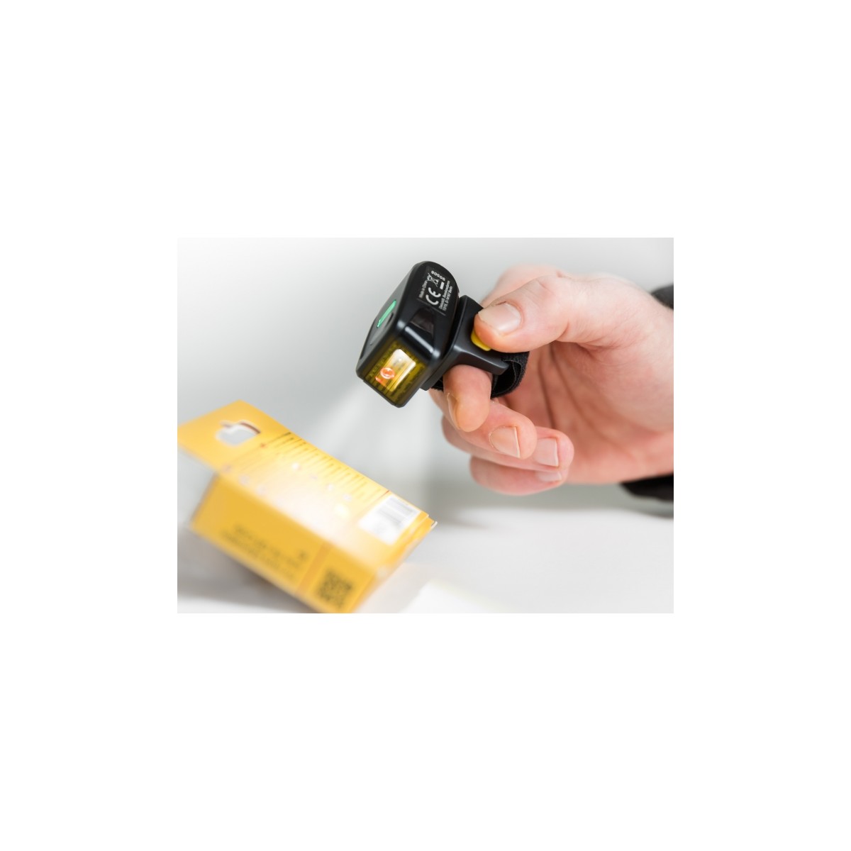 This small ring scanner can be practically attached to the finger with the hook-and-loop fastener, so that the wearer has his hands free, for example in order to hold a cardboard box. Thanks to the rotation possibility, the scanner can be rotated and is thus suitable for both right- and left-handed people.
