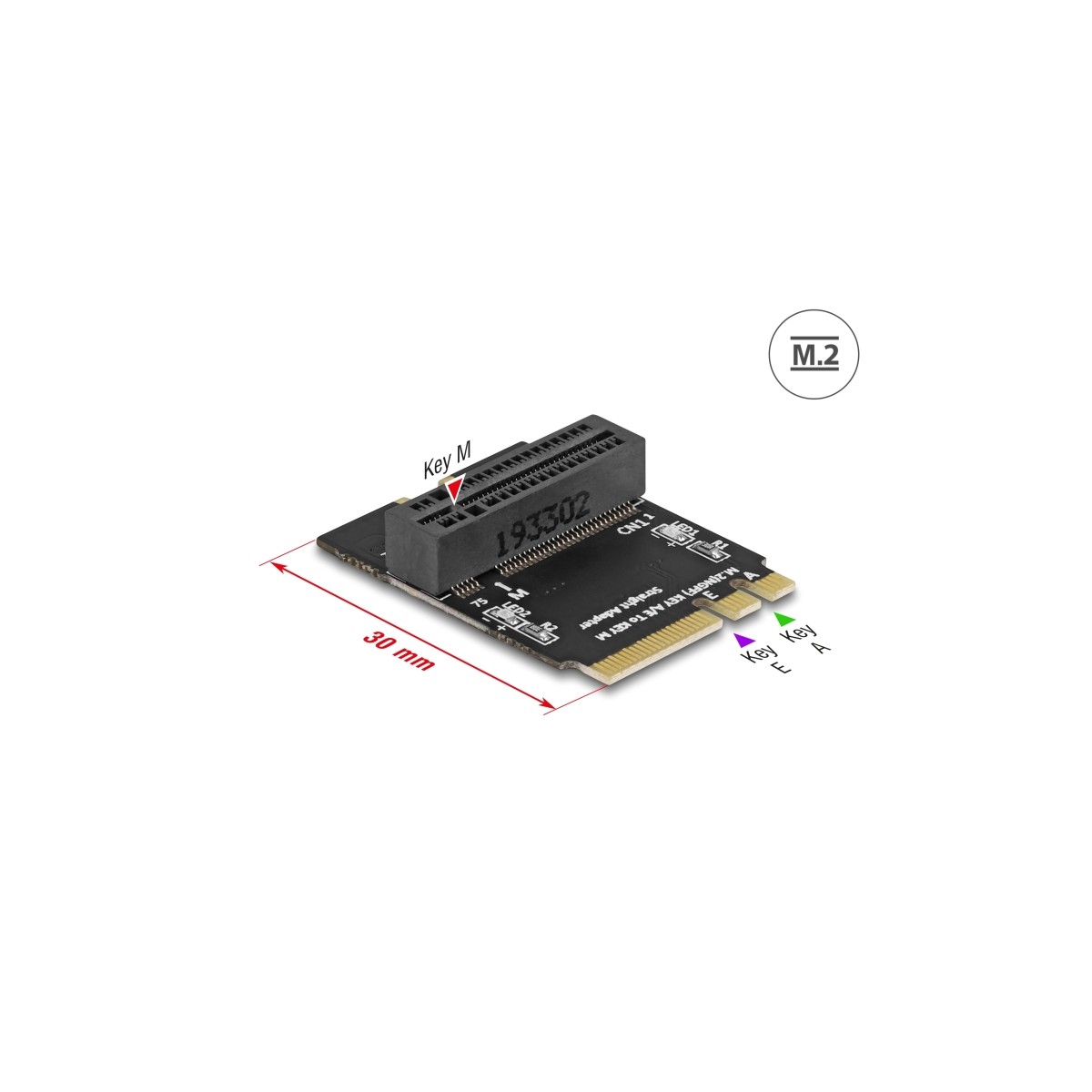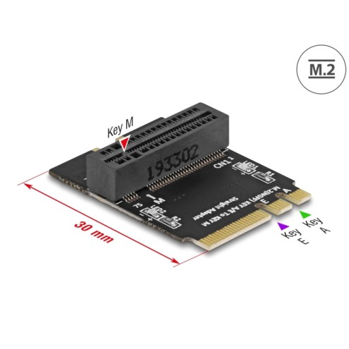 This adapter by Delock converts the M.2 key A or key E slot into a key M slot. An M.2 SSD can be connected vertically to this slot and fixed with the help of the holder.