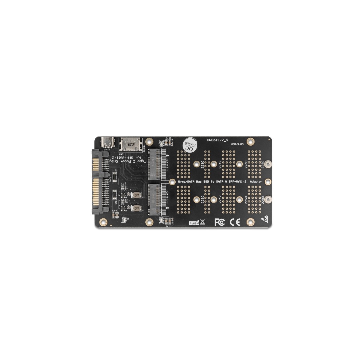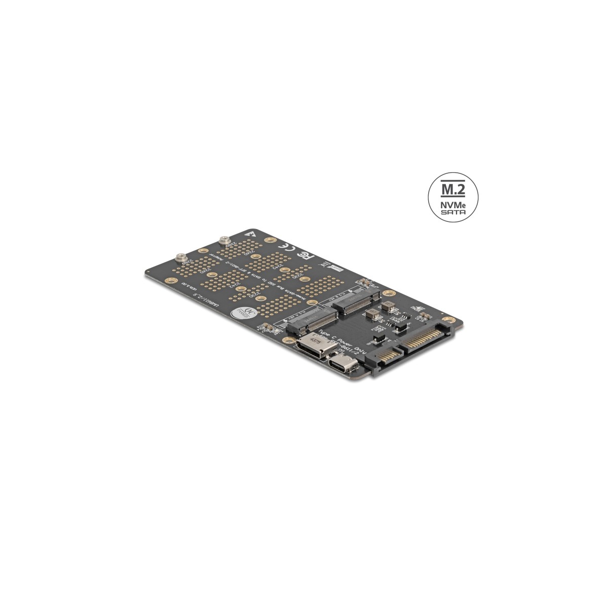 This Delock converter enables the connection of a M.2 SSD in 2280, 2260, 2242 and 2230 format with key B and a M.2 SSD in 2280, 2260, 2242 and 2230 format with key M. It allows the possibility to connect a M.2 SSD based on PCIe and M.2 SSD based on SATA at the same time. The converter connects via the SATA interface for SATA M.2 SSDs and via the SFF-8612 interface for PCIe M.2 SSDs, depending on the type of SSD used.