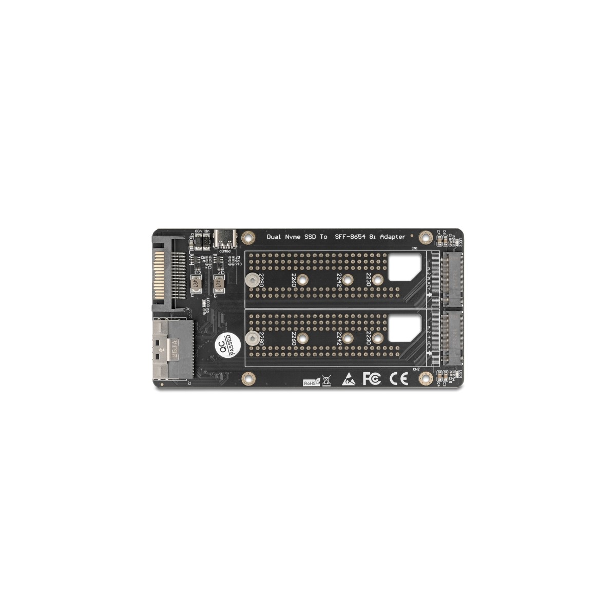 This converter by Delock enables the connection of two M.2 SSDs in 2280, 2260, 2242 and 2230 format with key M and operated simultaneously. The converter can be installed into the system through the SFF-8654 8i interface.