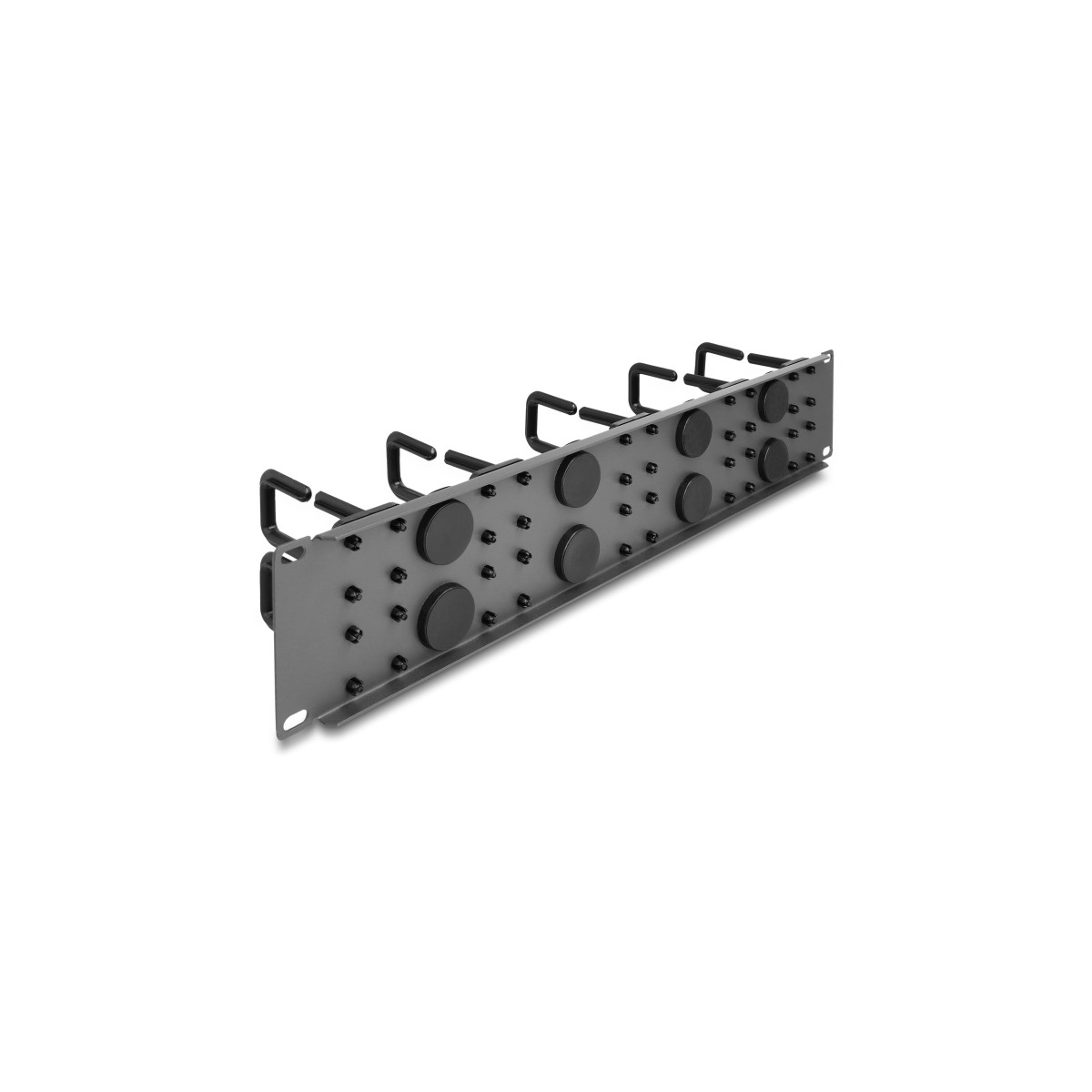Delock 19″ Cable Management Routing Panel with 8 rubber cable entries and 10 hooks 2U dark grey