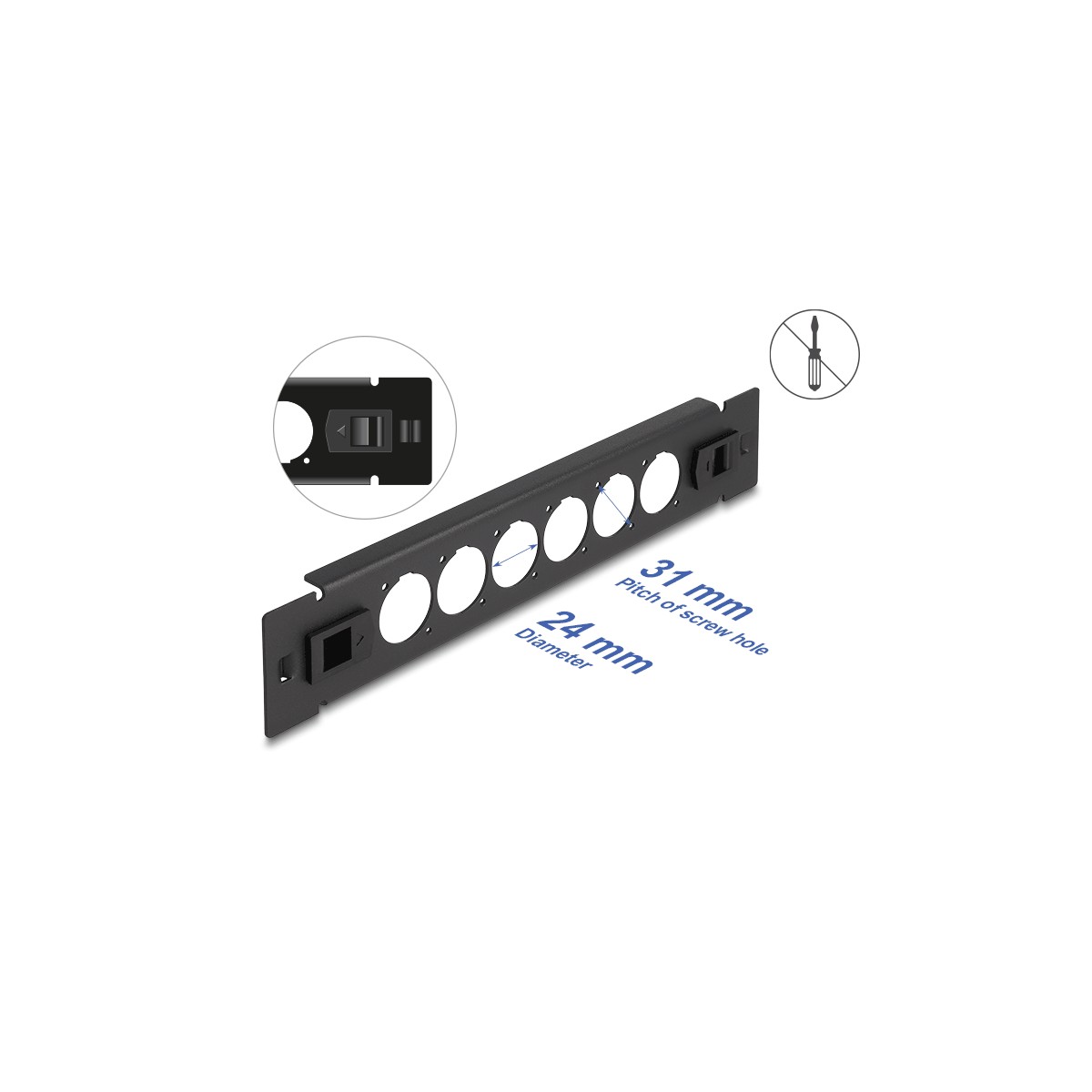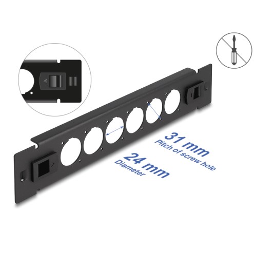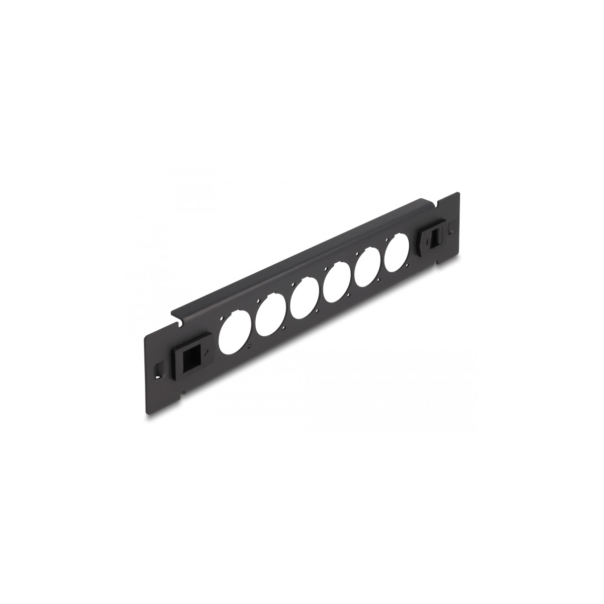 This patch panel by Delock can be mounted in a 10″ rack. With its standardized dimensions, it is suitable for easy mounting of 6 D-type modules.
