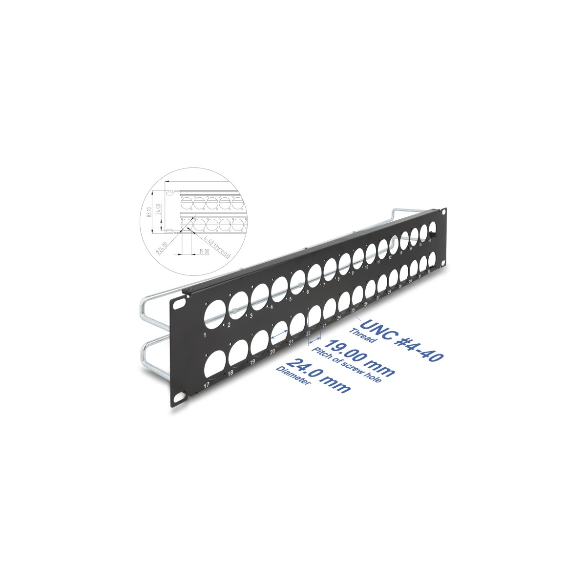 Delock 19″ D-Type Patch Panel with strain reliefs 32 port 2U black