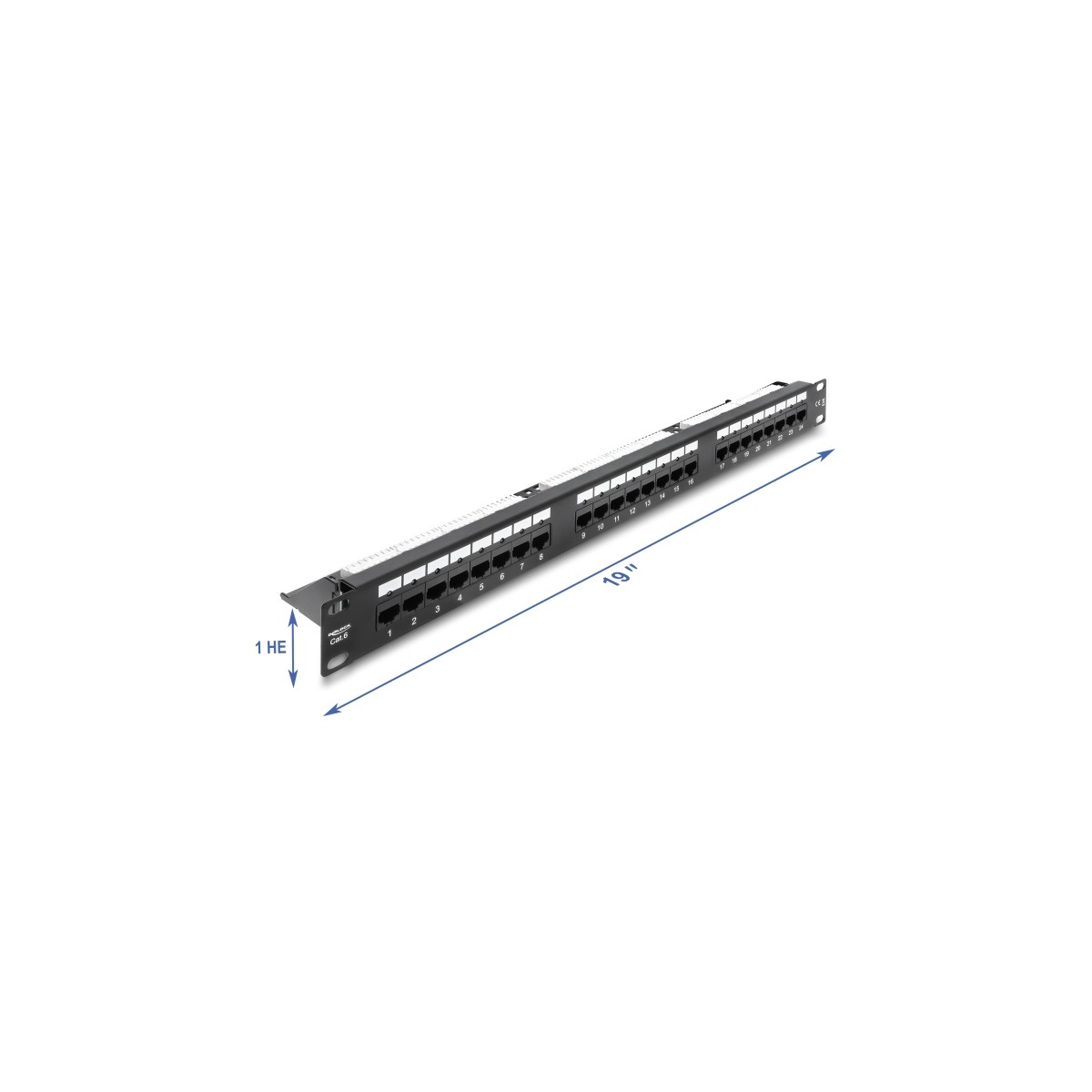 Delock 19″ 1U Patch Panel 24 port Cat.6 with LED and strain relief rail unshielded black