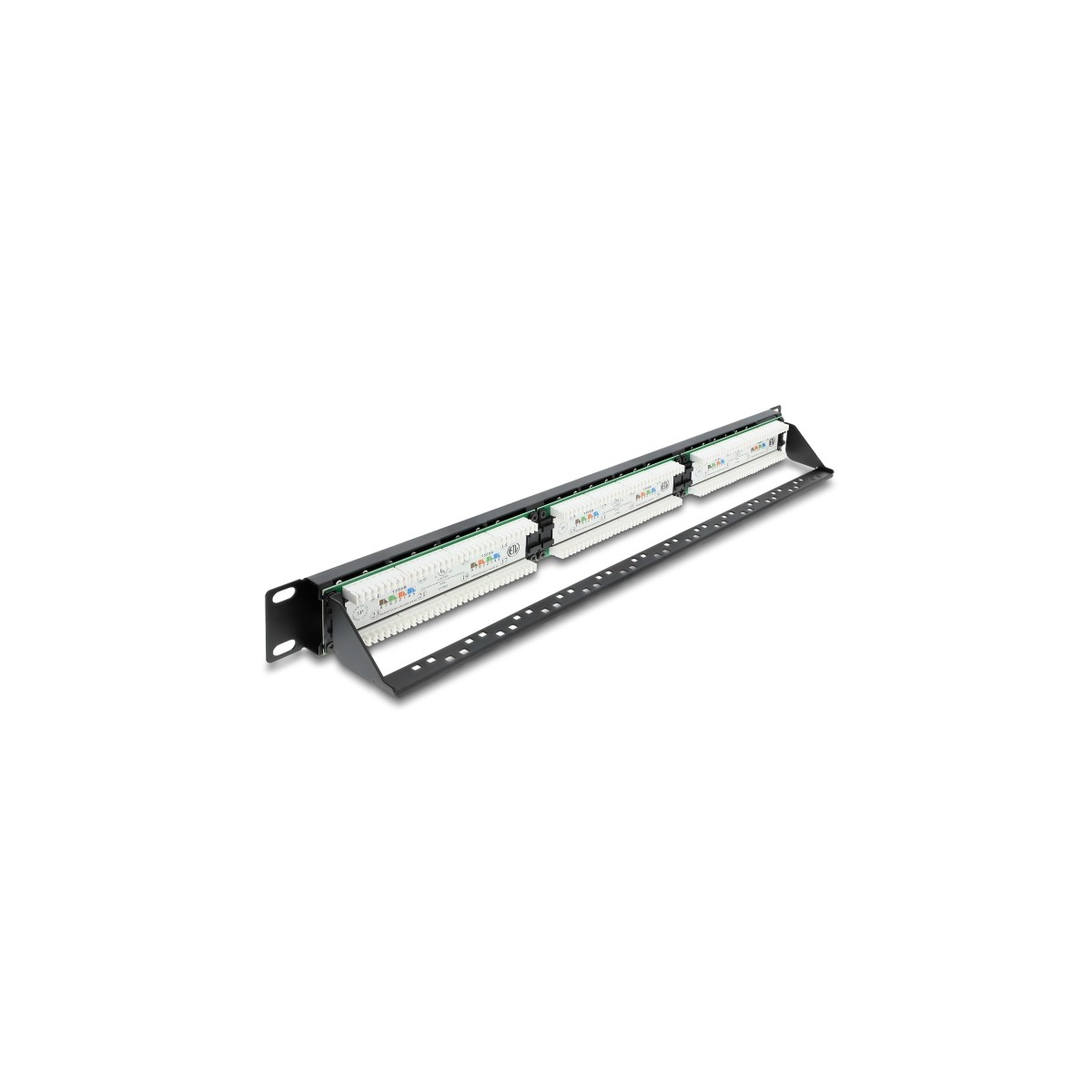 The 19″ patch panel (1U) with 24 Cat.6 RJ45 ports by Delock serves as a central distribution point for structured network cabling. The cables are securely connected via LSA connectors on the rear, while the robust metal housing ensures stability in the network cabinet.
