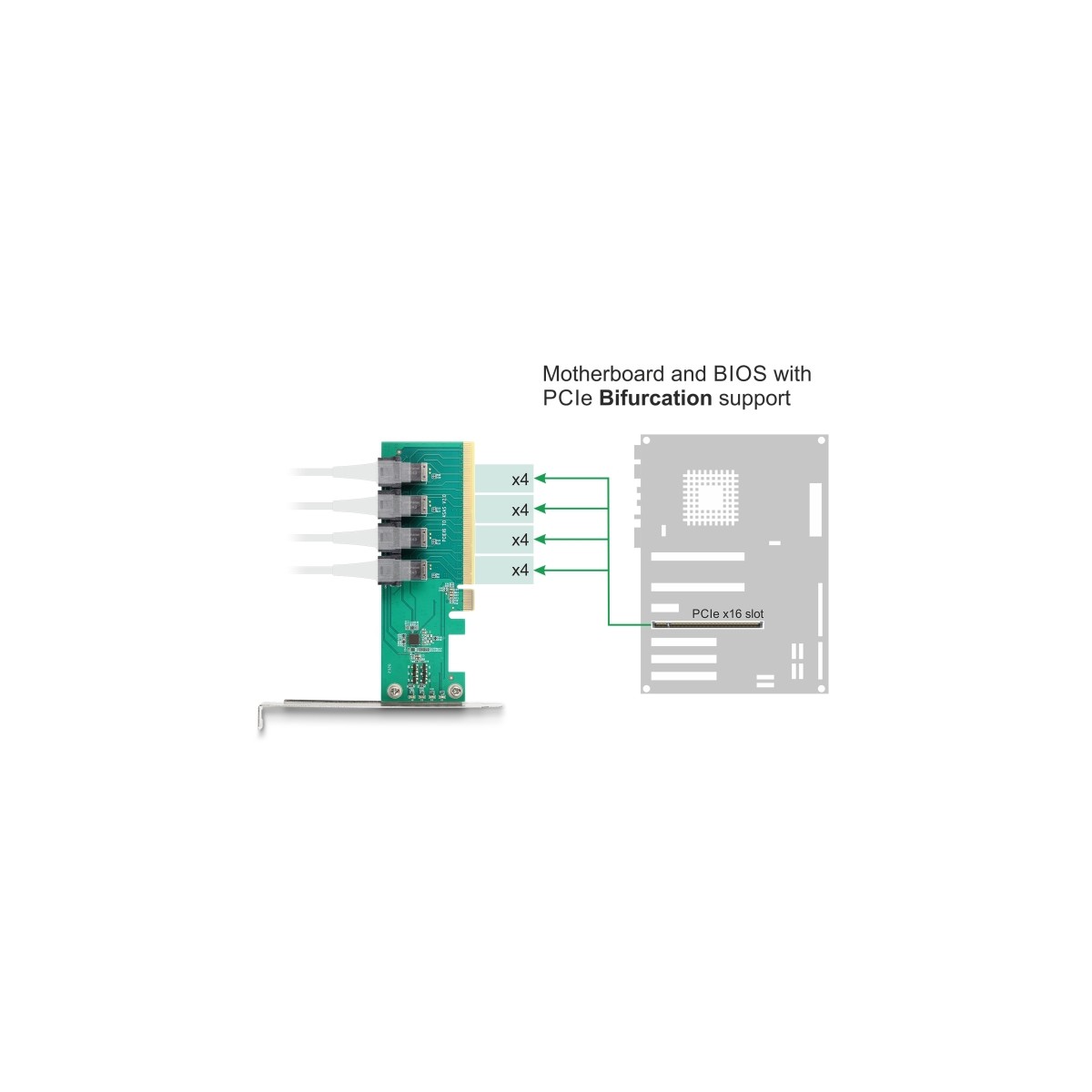 The card requires the PCIe bifurcation of the motherboard to split the PCIe signal in order to use multiple ports.
