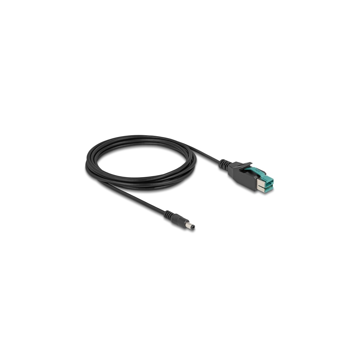 This PoweredUSB cable by Delock can be used to supply power to a device with DC 5.5 x 2.1 mm female port via a PC or hub with PoweredUSB 12 V port.