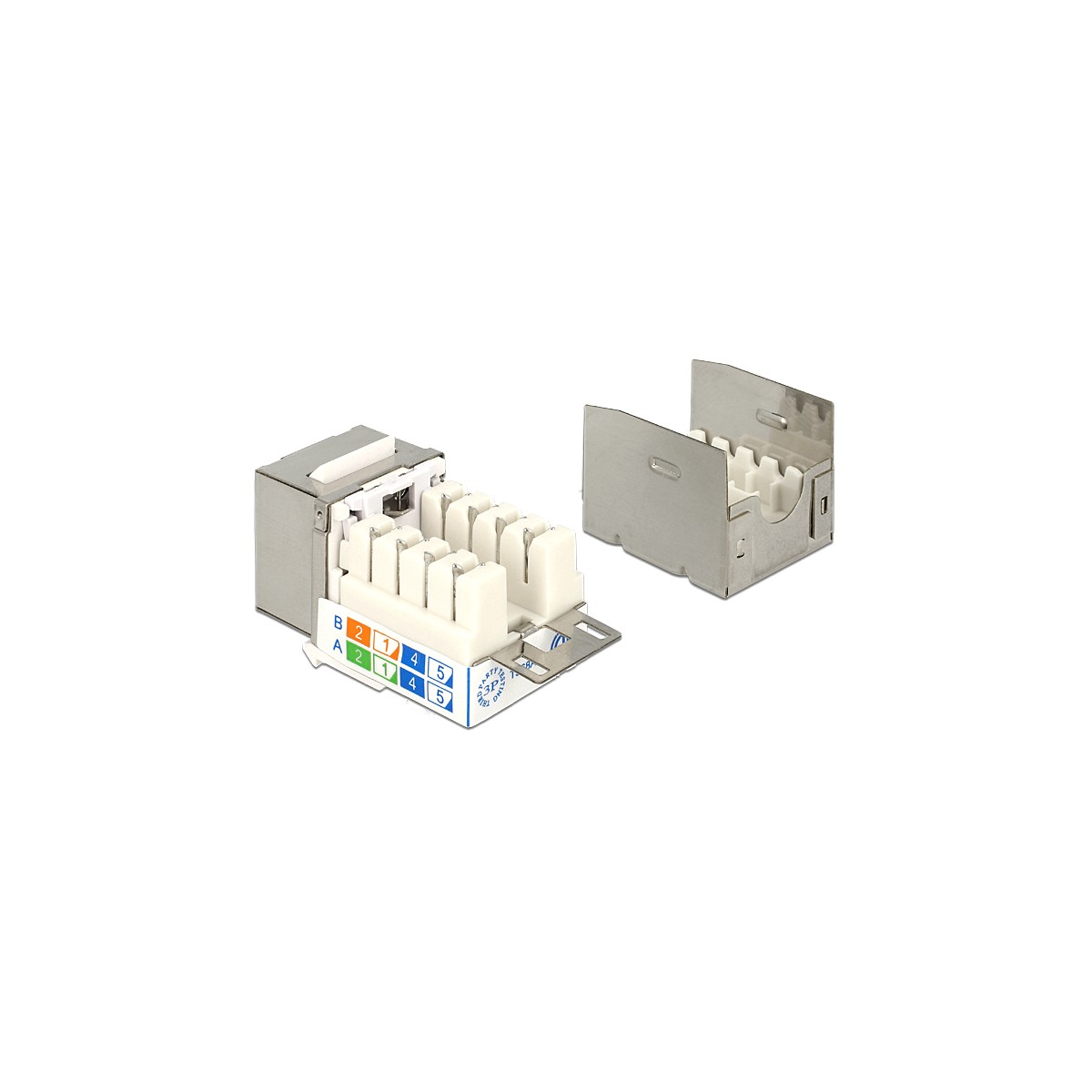 This module by Delock can be used to connect twisted pair cable to an RJ45 jack. With its standardised dimensions it can be used for easy snap-in mounting in e.g. a Keystone patch panel, face plate or surface-mount box.