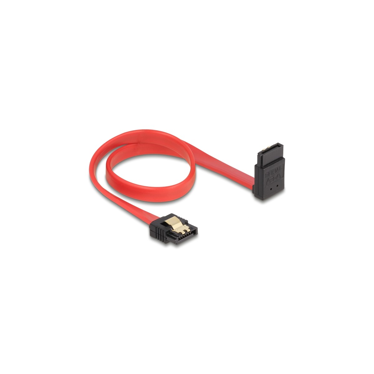This SATA cable by Delock enables the internal connection of various SATA devices, e.g. HDDs, controller cards or Flash memories. It complies with the latest standard and provides a data transfer rate of up to 6 Gb/s. It is downwards compatible to the previous SATA versions, but can then only reach the respective transfer speed. When connecting this cable to a HDD the cable will be lead upwards. The metal clips on the connectors ensure that the cable reliably clicks into place.