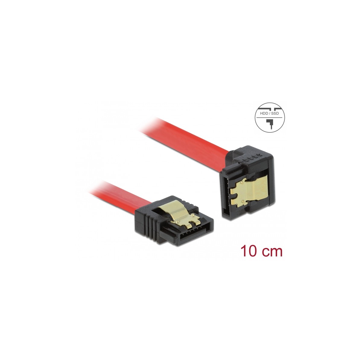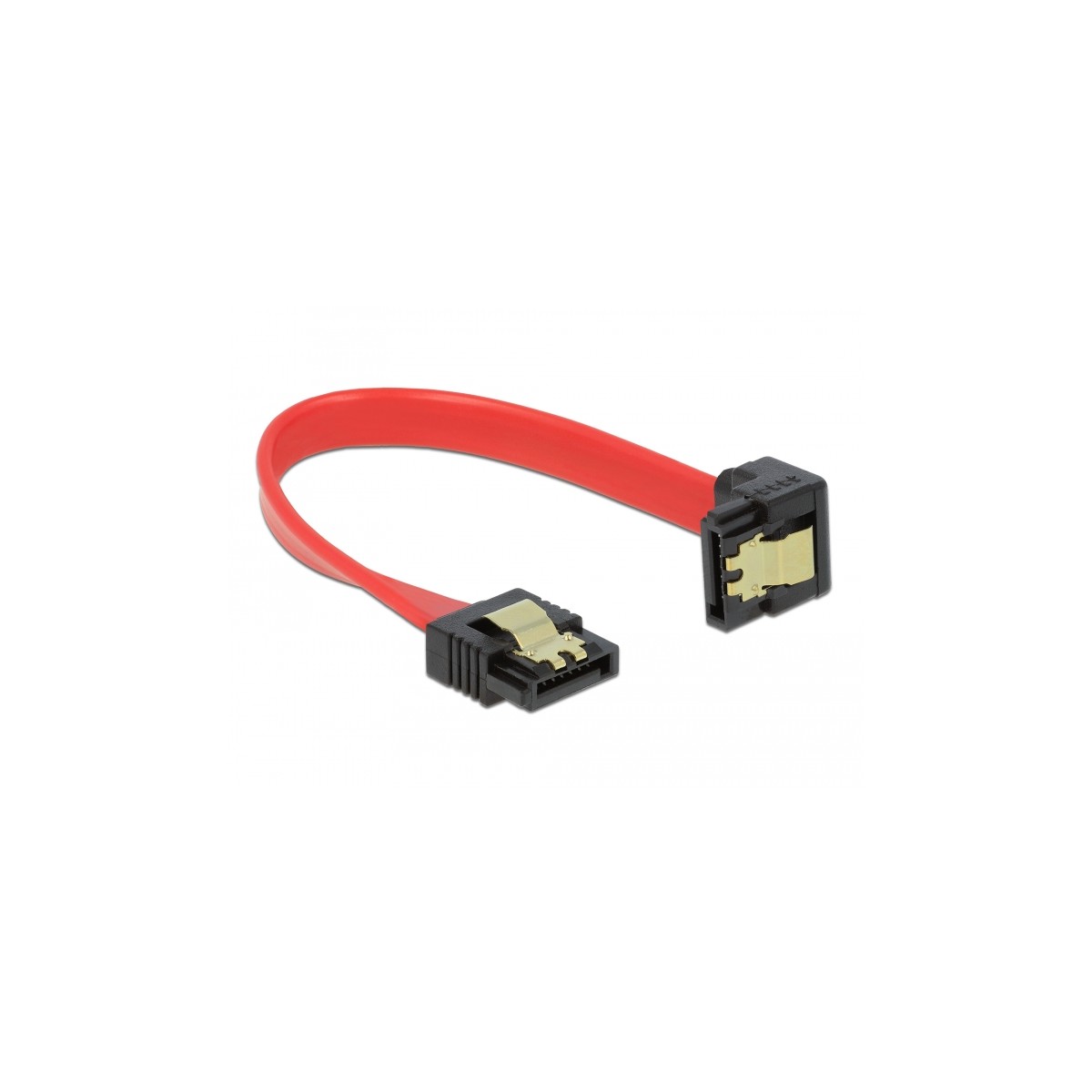 This SATA cable by Delock enables the internal connection of various SATA devices, e.g. HDDs, controller cards or Flash memories. It complies with the latest standard and provides a data transfer rate of up to 6 Gb/s. It is downwards compatible to the previous SATA versions, but can then only reach the respective transfer speed. When connecting this cable to a HDD the cable will be lead downwards. The metal clips on the connectors ensure that the cable reliably clicks into place.