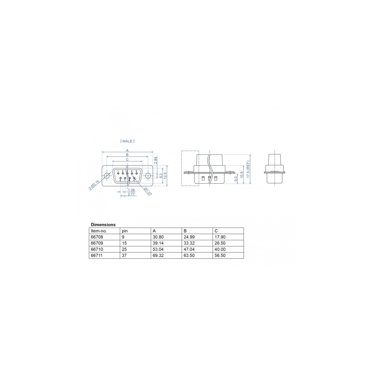 This D-Sub male connector by Delock is suitable for cable mounting. On the back side there are through holes for inserting crimp contacts.