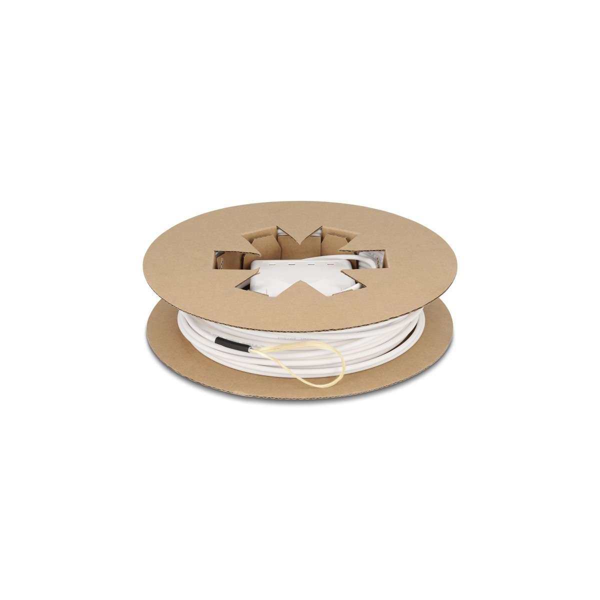 The drop cable is on a reel in a cardboard box and the cables are already mounted in the connection box. The closed cardboard box allows cables to be easily pulled out and laid right up to the house distributor.