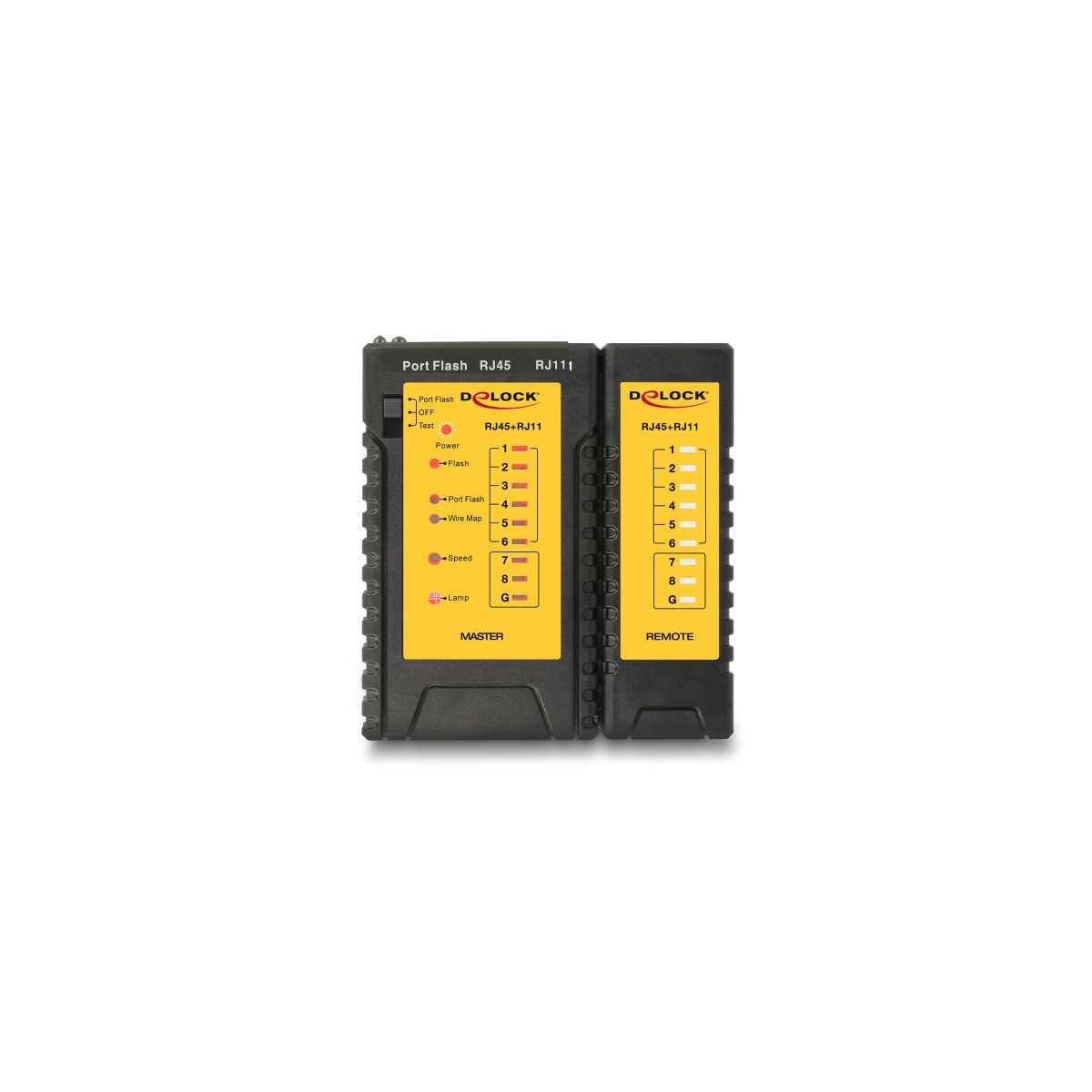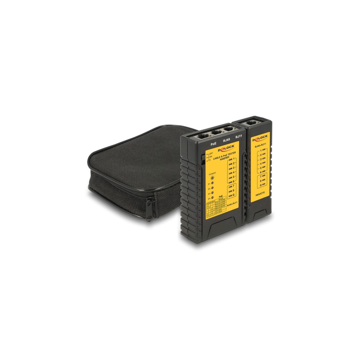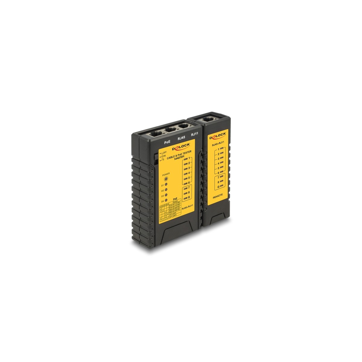 With this cable tester by Delock network cables can be tested quickly and easily. In addition, an attached PoE power source can be tested. To test already installed cables the attached remote unit can be removed from the tester.
