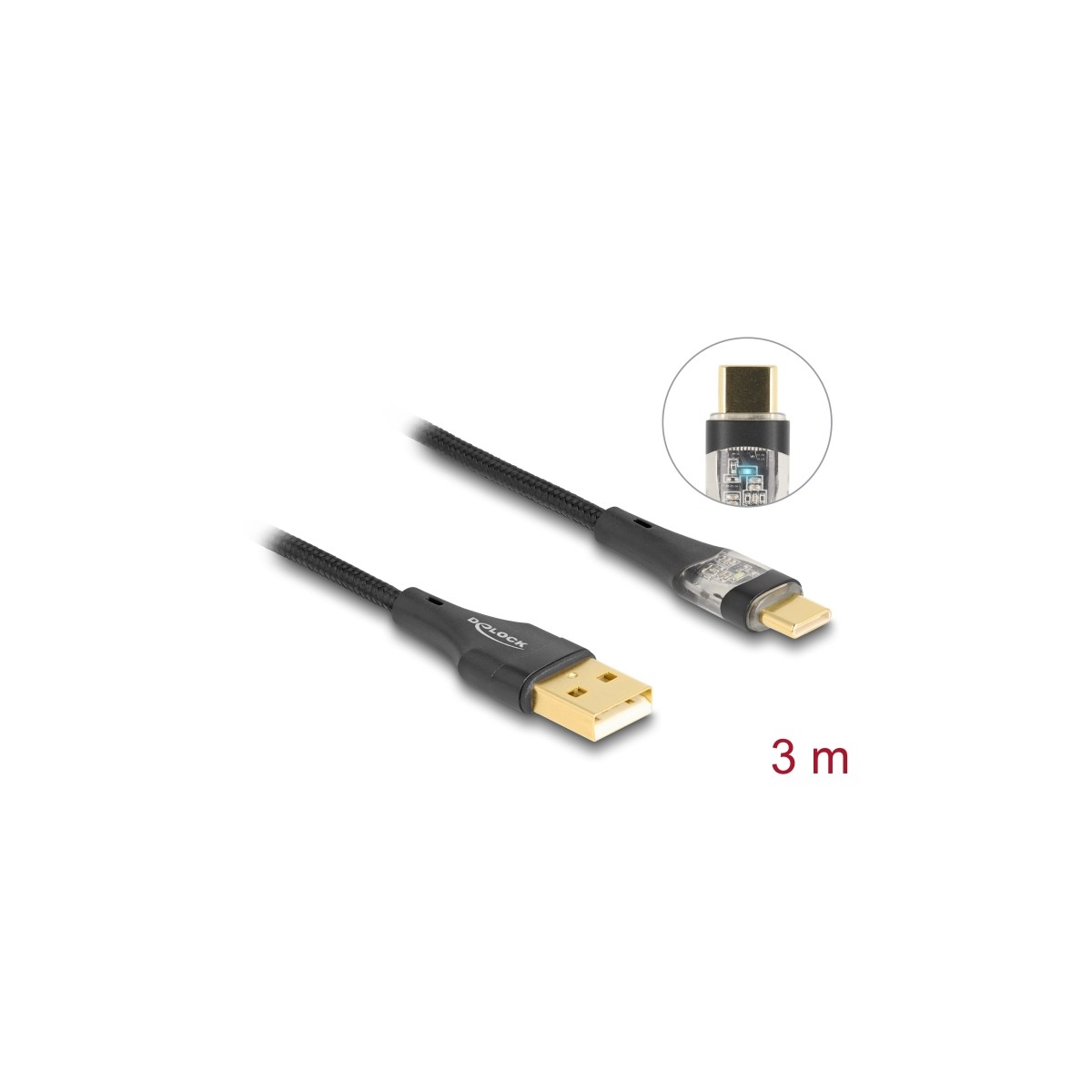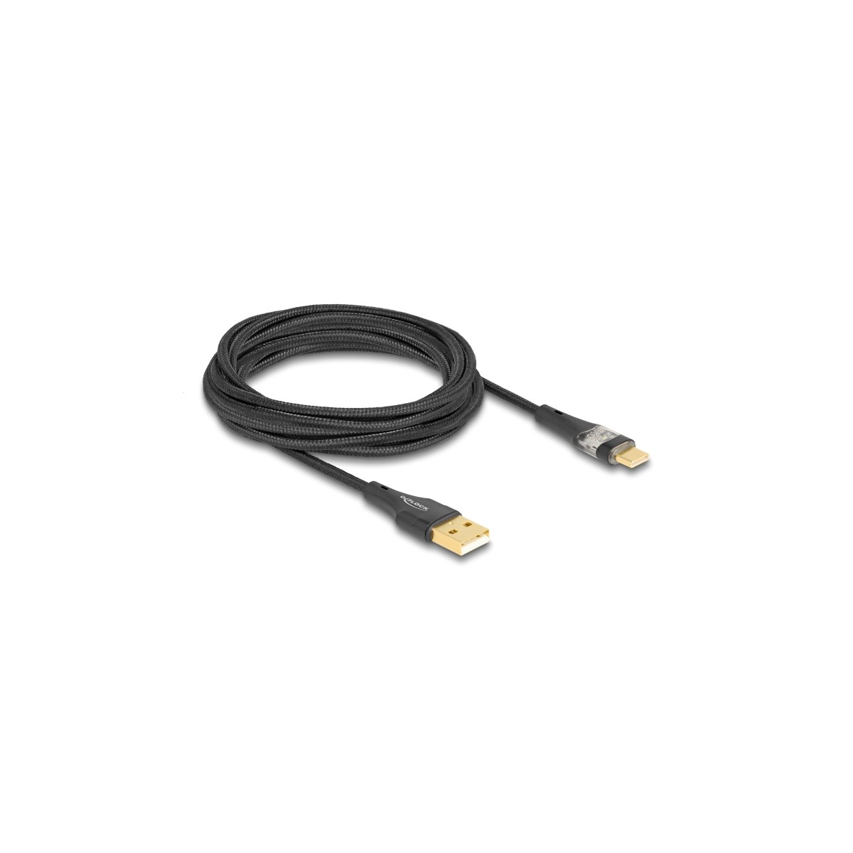 This USB cable by Delock enables the connection between a device with a USB Type-C™ connector and a PC or a laptop equipped with a free USB port. Optically it convinces with its fine textile shielding and with its transparent USB Type-C™ connector. As soon as the cable is connected to a power source, a LED lights up in blue.