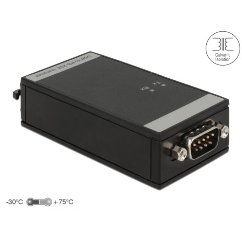This USB 2.0 to serial RS-232 converter by Delock offers an RS-232 connection for measuring devices, POS systems, printers, modems, IoT devices etc. The galvanic isolation prevents data transmission errors with uneven earthing potentials, ground loops or voltage spikes. The converter is suitable for DIN rail mounting.