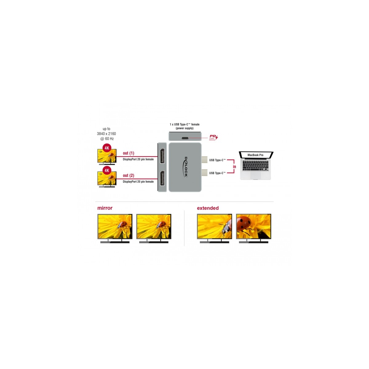This adapter by Delock can be connected to a MacBook with two adjacent Thunderbolt™ 3 ports, e.g. the MacBook Pro. Two monitors can be operated at the DisplayPort outputs with 4K 60 Hz simultaneously.