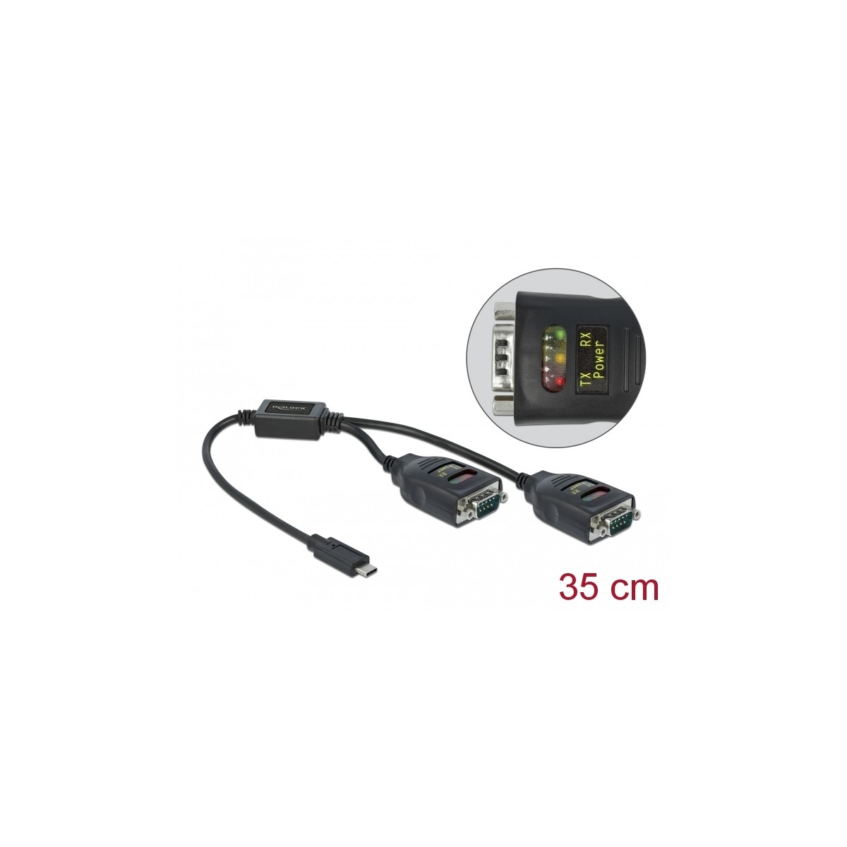 This USB Type-C™ to serial adapter by Delock provides two RS-232 DB9 interfaces for printers, measuring instruments, controllers, IoT devices etc. At each of the RS-232 ports three LEDs indicate the transmission and reception status as well as the USB power.